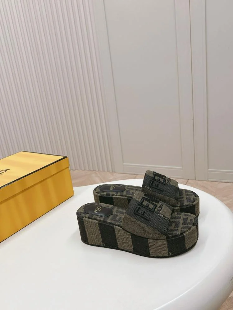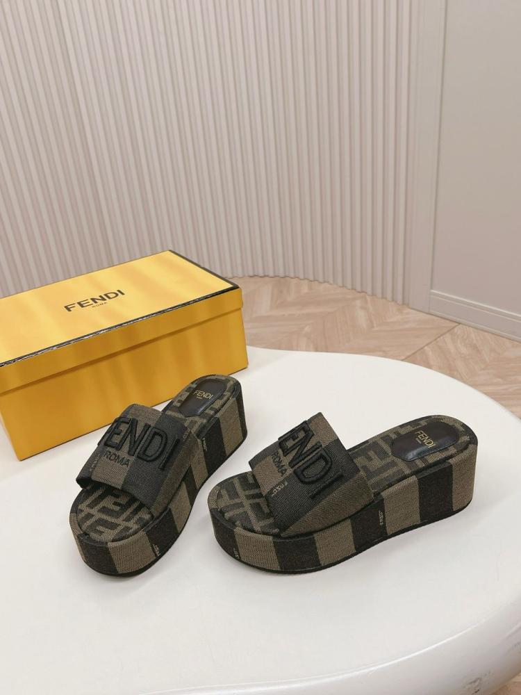 Sandales à large bride et semelle plateforme. En tissu à rayures Pequin marron. Voûte plantaire en tissu jacquard avec motif FF emblématique dans les mêmes tons. Broderie Fendi Roma en fil marron.