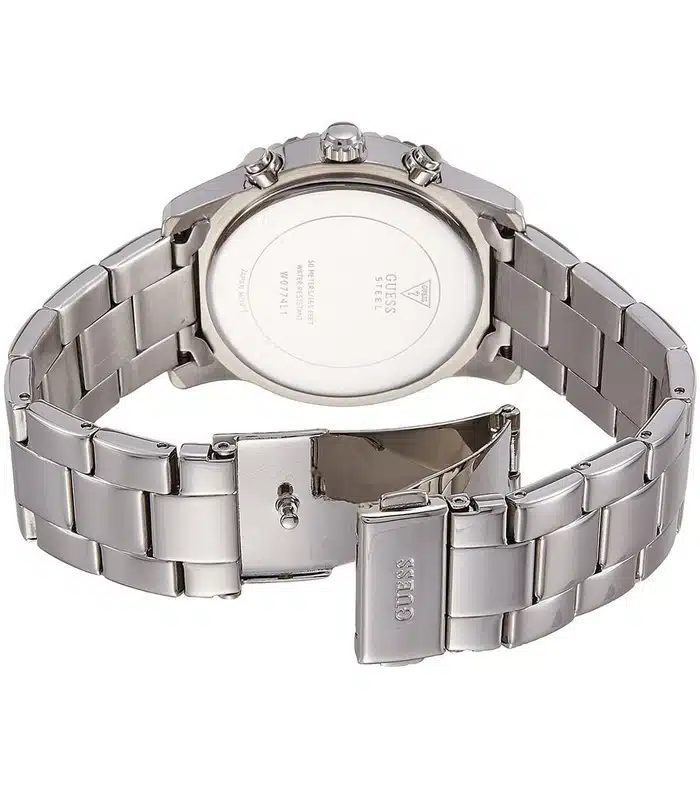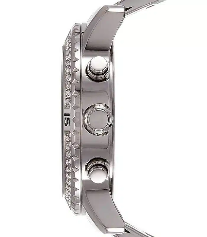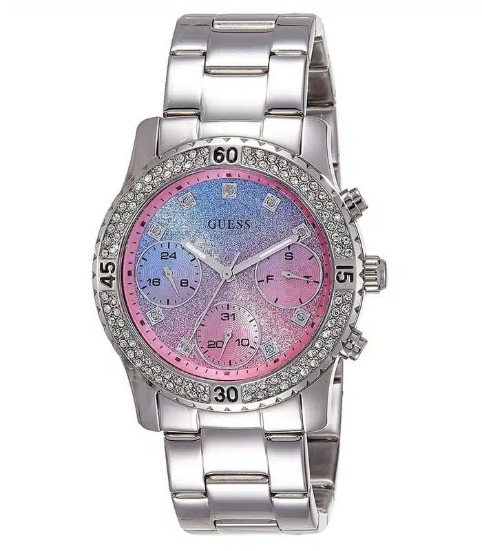 Montre pour Femme de la Marque : Guess – Référence : W0774L1 – Fonctionnalités : Chronographe – Mouvement : Quartz – Matière du boîtier : Acier inoxydable – Diamètre du boîtier : 36 mm – Matière du bracelet : Acier inoxydable – Largeur du bracelet : 18 mm – Type de verre : Minéral – Garantie : 2 ans Livré avec son coffret original, sac et certificat d’authenticité.