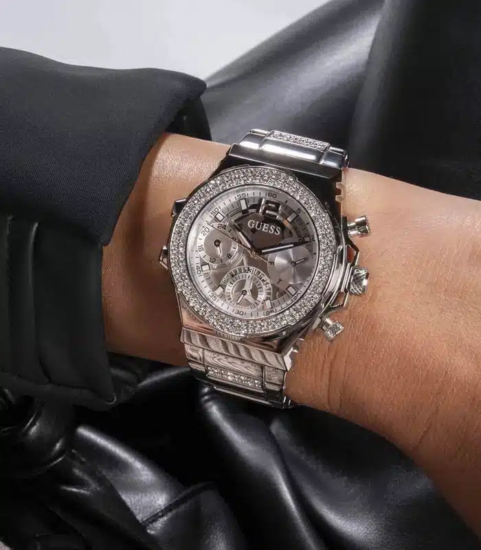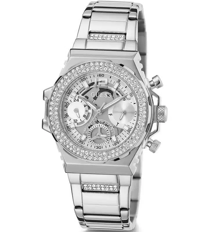 Montre pour Femme de la Marque : Guess – Référence : GW0552L1 – Fonctionnalités : Chronographe – Mouvement : Quartz – Matière du boîtier : Acier inoxydable – Diamètre du boîtier : 36 mm – Matière du bracelet : Acier inoxydable – Largeur du bracelet : 22 mm – Type de verre : Minéral – Garantie : 2 ans Livré avec son coffret original, sac et certificat d’authenticité.