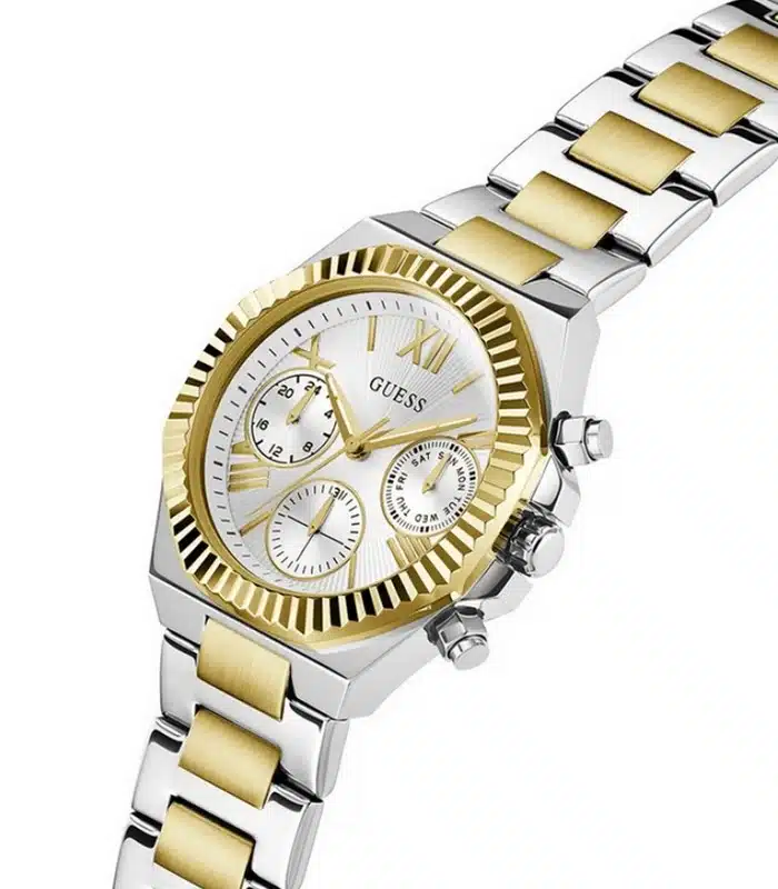 Montre pour Femme de la Marque : Guess – Référence : GW0769L3 – Fonctionnalités : Chronographe – Mouvement : Quartz – Matière du boîtier : Acier inoxydable – Diamètre du boîtier : 38 mm – Matière du bracelet : Acier inoxydable – Largeur du bracelet : 22 mm – Type de verre : Minéral – Garantie : 2 ans Livré avec son coffret original, sac et certificat d’authenticité.
