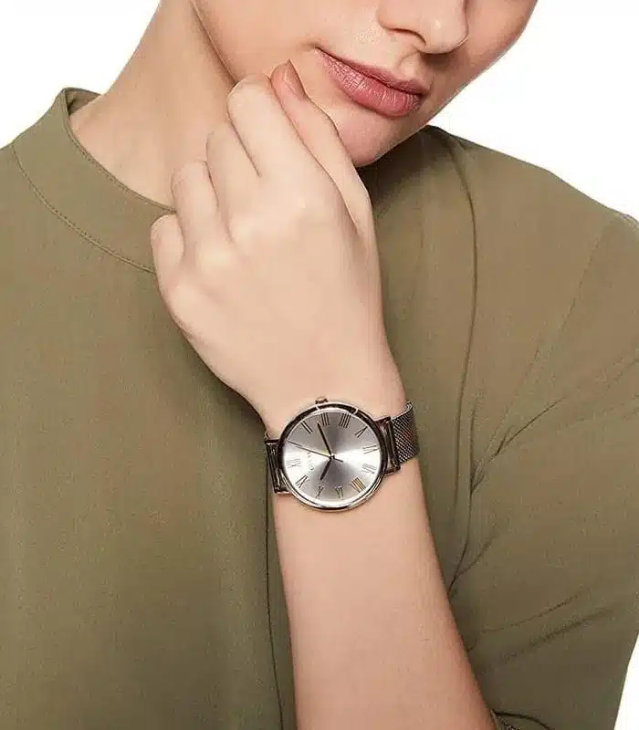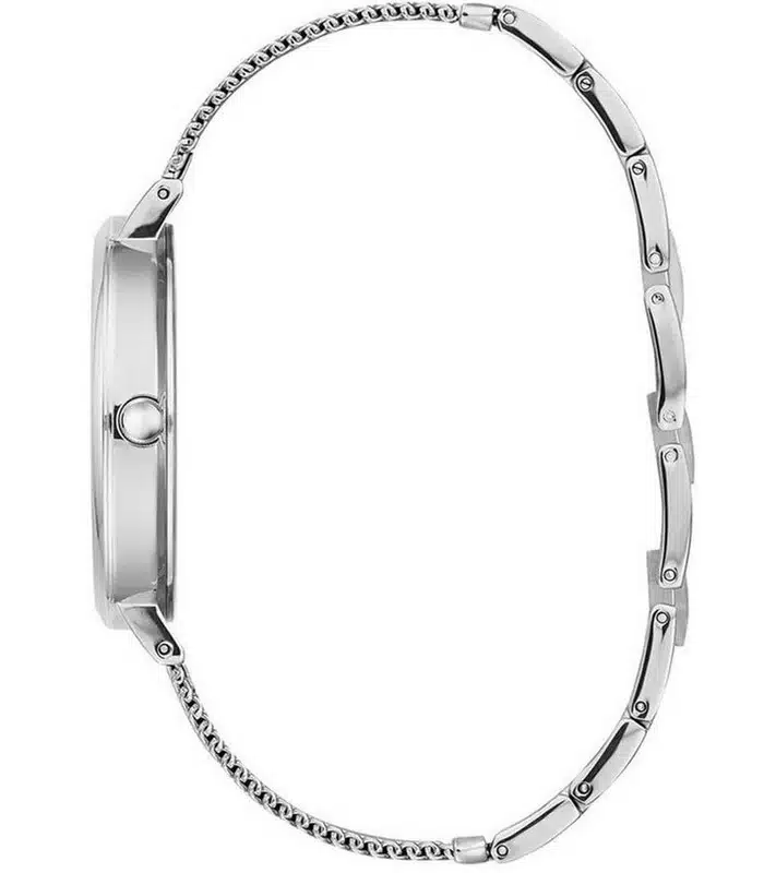 Montre pour Femme de la Marque : Guess – Référence : W1155L1 – Fonctionnalités : Analogique – Mouvement : Quartz – Matière du boîtier : Acier inoxydable – Diamètre du boîtier : 38 mm – Matière du bracelet : Acier inoxydable – Largeur du bracelet : 16 mm – Type de verre : Minéral – Garantie : 2 ans Livré avec son coffret original, sac et certificat d’authenticité.