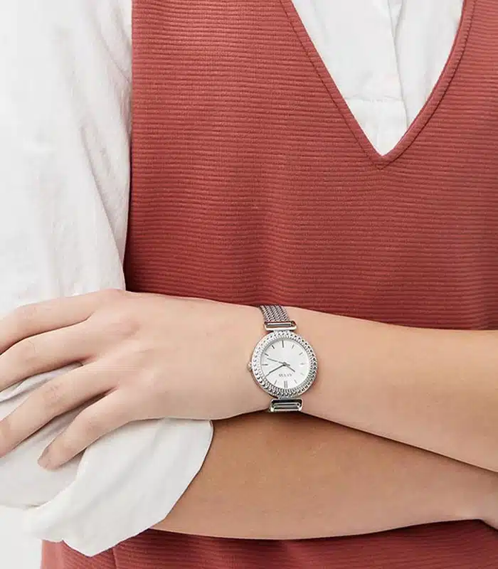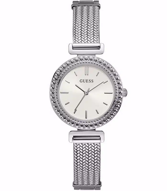 Montre pour Femme de la Marque : Guess – Référence : W1152L1 – Fonctionnalités : Analogique – Mouvement : Quartz – Matière du boîtier : Acier inoxydable – Diamètre du boîtier : 32 mm – Matière du bracelet : Acier inoxydable – Largeur du bracelet : 18 mm – Type de verre : Minéral – Garantie : 2 ans Livré avec son coffret original, sac et certificat d’authenticité.