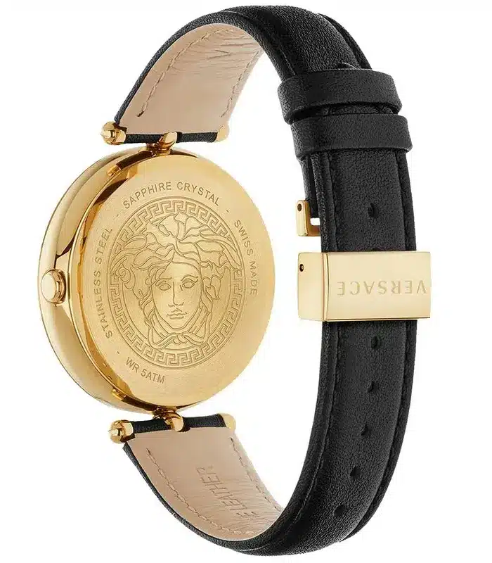 Montre pour Femme de la Marque : Versace – Référence : VO020017 – Fonctionnalités : Analogique – Mouvement : Quartz – Matière du boîtier : Acier inoxydable – Diamètre du boîtier : 39 mm – Matière du bracelet : Cuir – Largeur du bracelet : 16 mm – Type de verre : Saphir – Garantie : 2 ans Livré avec son coffret original, sac et certificat d’authenticité.